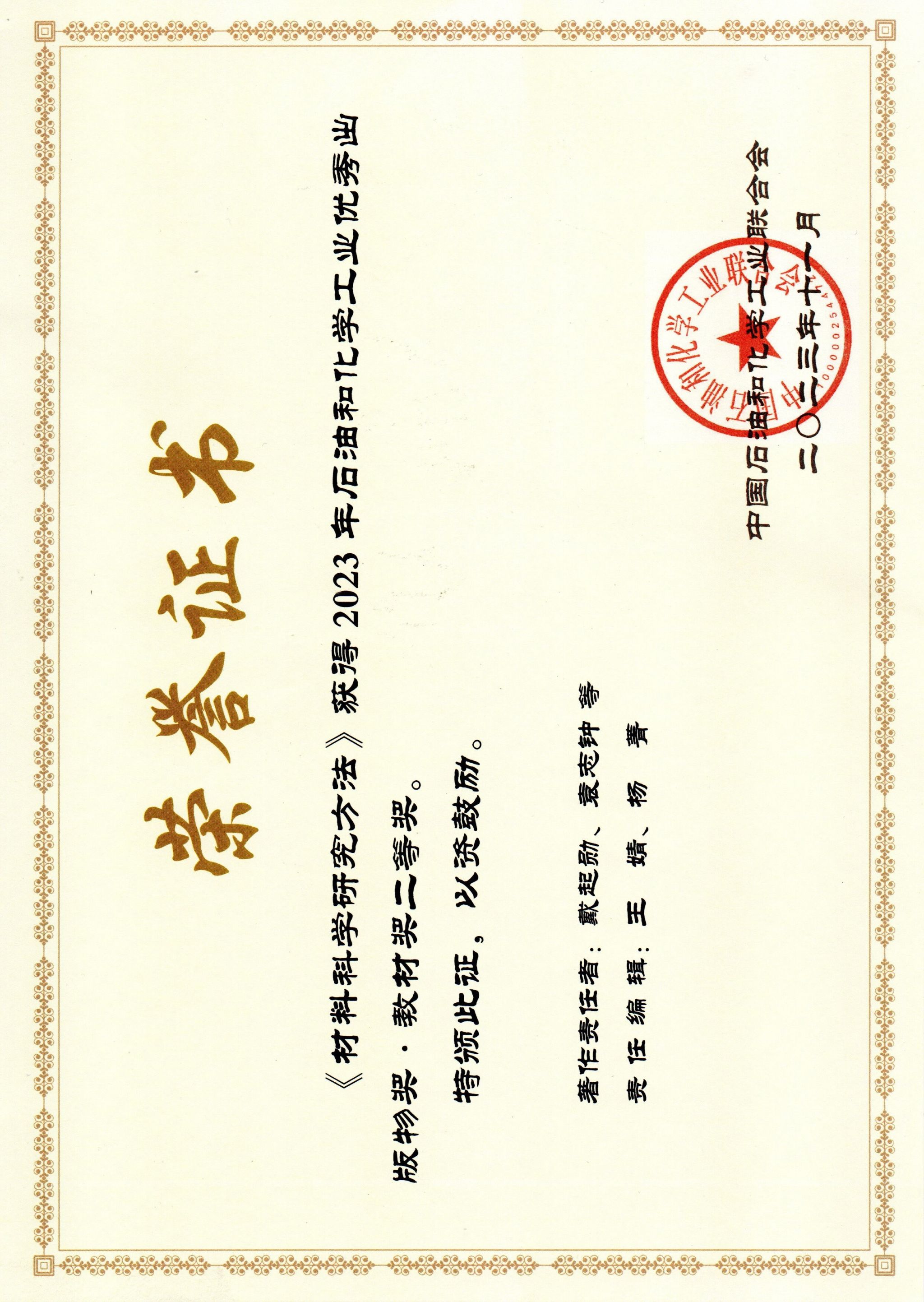 教材二等奖,由中国石油和化学工业联合会于二〇二三年十一月颁发荣誉证书