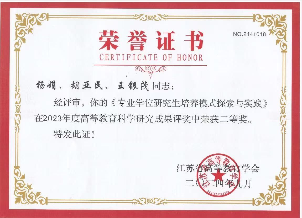 我院杨娟、胡亚民、王银茂完成的《专业学位研究生培养模式探索与实践》,在2023 年度高等教育科学研究成果评奖中荣获二等奖,由江苏省高等教育学会于二〇二四年九月颁发荣誉证书。这一成果彰显了我院在研究生培养模式创新领域的实力,我院将持续深化教育教学研究,助力人才培养质量提升。